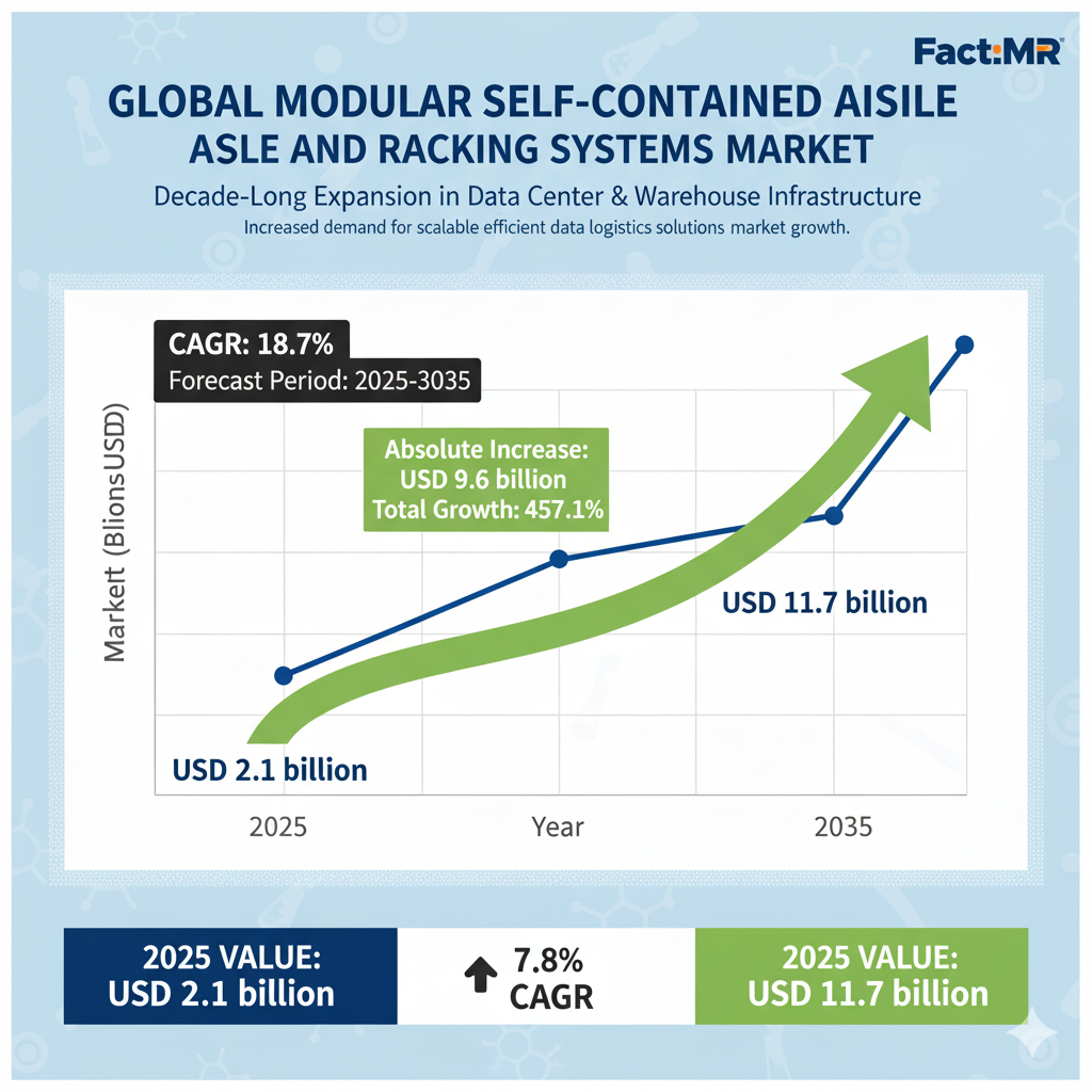MD, UNITED STATES, October 16, 2025 /EINPresswire.com/ -- The global modular self-contained aisle and racking systems market is projected to grow from USD 2.1 billion in 2025 to approximately USD 11.7 billion by 2035, recording an absolute increase of USD 9.6 billion over the forecast period. This translates into a total growth of 457.1%, with the market forecast to expand at a compound annual growth rate (CAGR) of 18.7% between 2025 and 2035. This unprecedented growth trajectory underscores a major shift toward smart warehousing, modular data centers, and energy-efficient storage infrastructure across global industries.